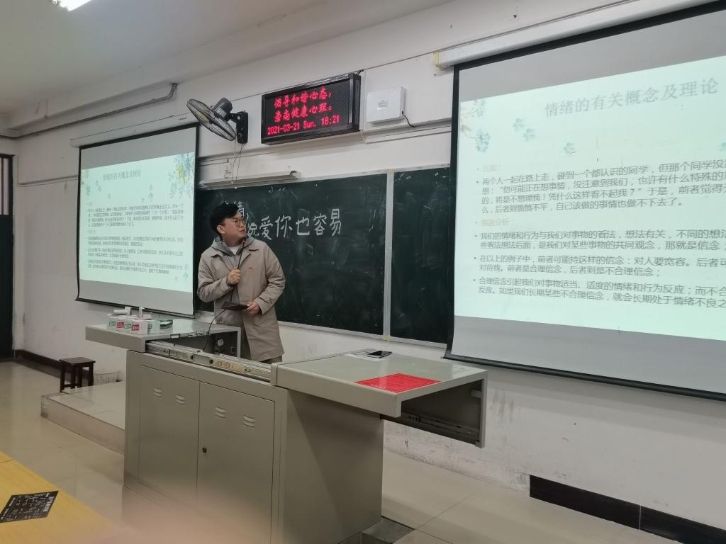 为增强员工心理健康素质,营造和谐融洽的校园氛围,3月21日晚18:15,BB贝博艾弗森官网于5302和5304教室举行了主题为“情绪,想说爱你也容易”的心理团课。活动由心理部和思政部联合举办,20级全部员工参与了团课。