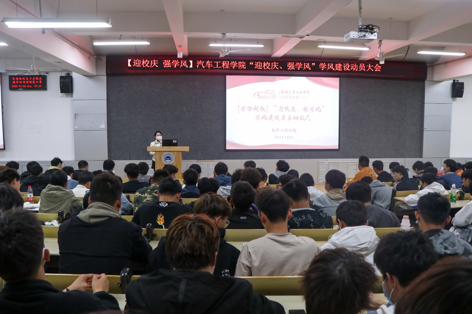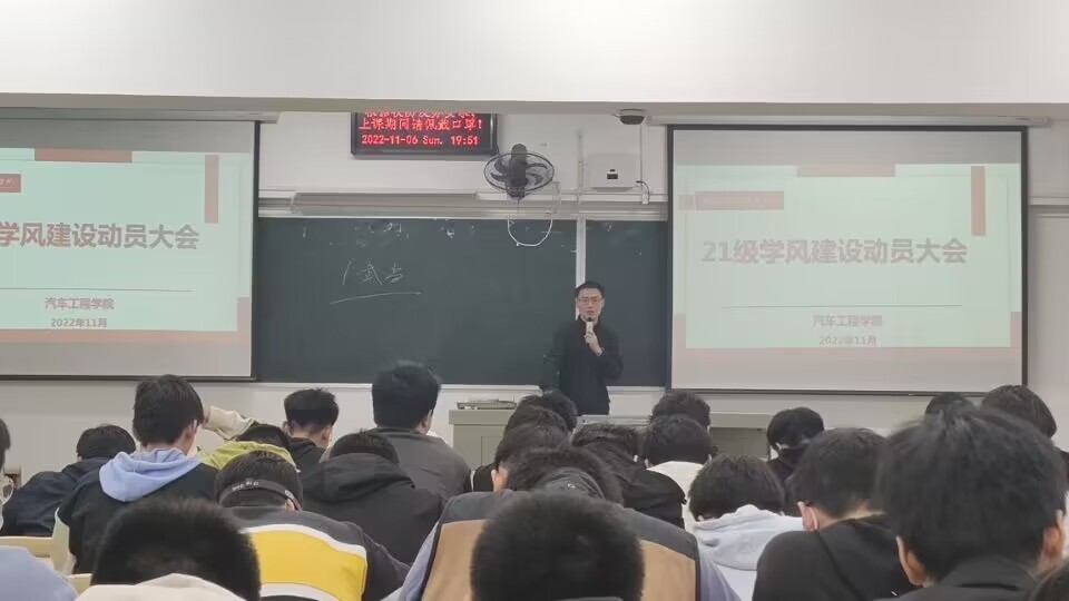 BB贝博艾弗森官网11月6日晚在6113报告厅、5201教室分年级召开以“迎校庆、强学风”为主题的学风建设动员大会。BB贝博艾弗森官网学工办主任胡霄寒、辅导员李键雯、李旭、甘甜以及车院全体员工参加了此次活动。