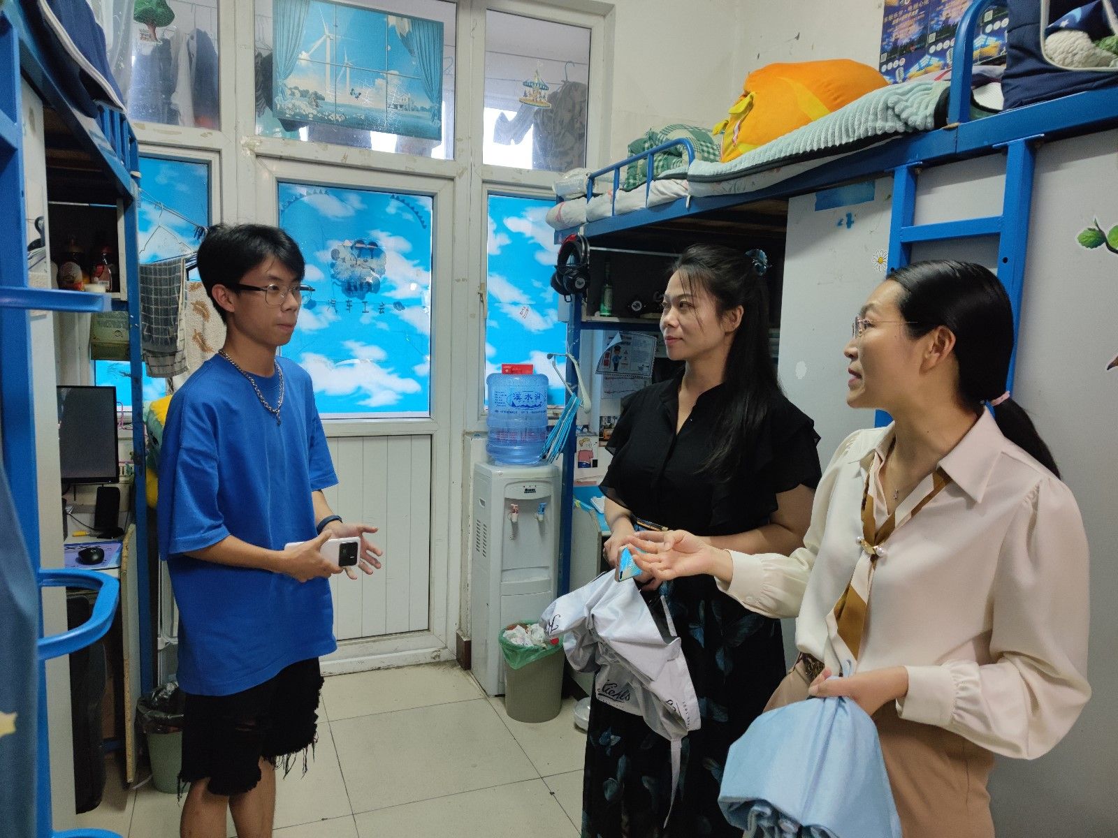 26日下午,学工部副部长杜昕俊,学院副书记周彬及辅导员李旭、甘甜等人前往李四、桃三、桃一留校员工及车队员工。每到一处,杜昕俊都叮嘱同学们,注意关注防范恶劣天气,出行注意安全,非必要不外出,并提醒同学们在努力学习的同时要注意补充营养、防暑降温。
