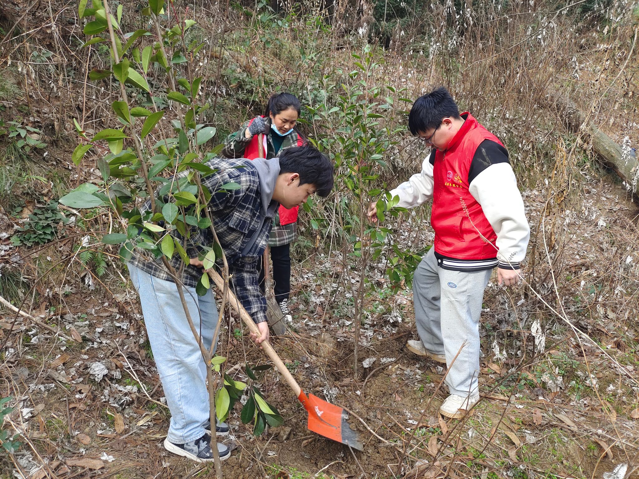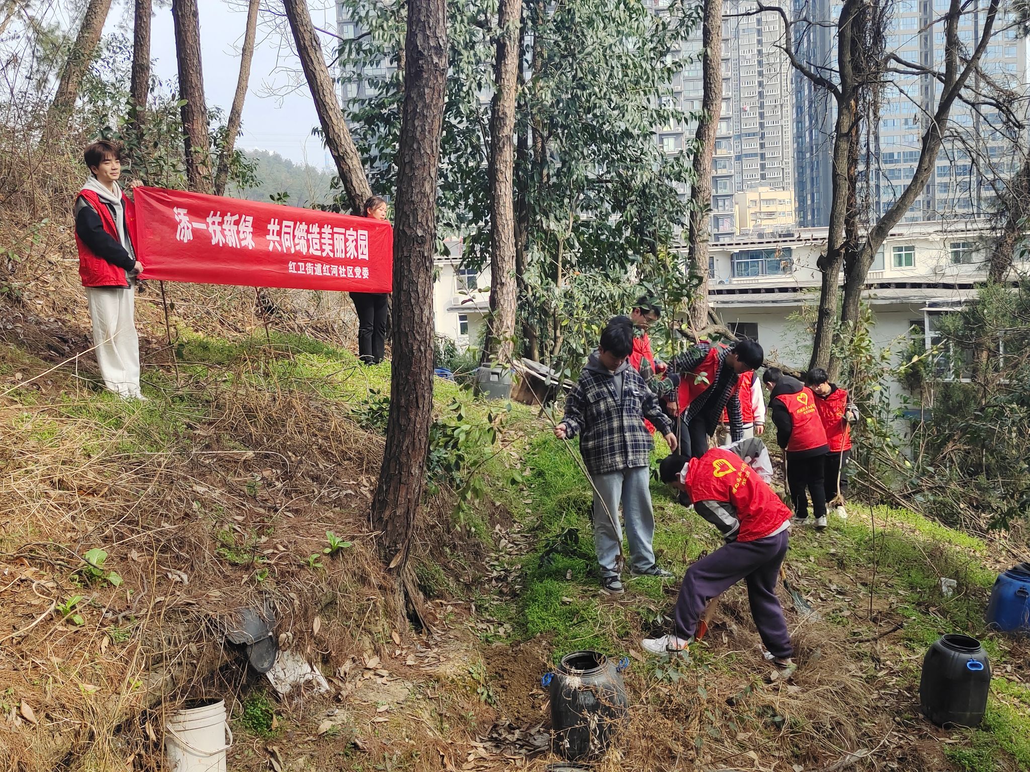 活动现场,志愿者们个个精神饱满,斗志十足,分组领取工具,进行刨坑、种苗、填土、扶苗、浇水等工作。每组志愿者们齐心协力,紧密配合,经过两个小时的栽种,志愿者们共种植树苗40余棵,为本来枯黄的山坡增添了一抹新绿。植树结束后,志愿者们积极向周围居民宣传环保知识,倡议广大居民积极参与到养绿护绿的活动中来,共同关注生态环境,共建绿色家园。