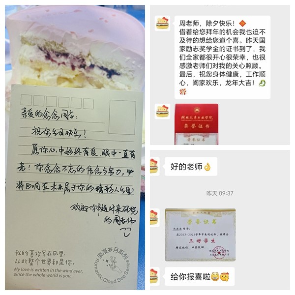据悉,车辆221班的冯念念同学是BB贝博艾弗森官网分党委副书记周彬的结对员工,她所在的205宿舍也是周彬的结对宿舍。结对大半年来,周彬时常与冯念念谈心谈话,了解生活学习中的困难,引导做好学业和职业生涯规划。2024年春节,在收到学院寄来的国家励志奖学金和评为校级“三好员工”后,冯念念第一个给老师报喜。近日,在谈话过程中得知3月6日是她的生日后,周彬当即决定为她和结对宿舍过一个集体生日,亲手为冯念念带上了生日帽,送上了生日蛋糕和亲手写的生日祝福。