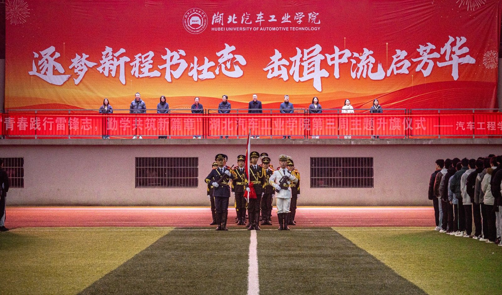 本网讯(文 赵梦迪、曹闪闪/图 张佳麒)3月10日早上,BB贝博艾弗森官网在校田径场举行“青春践行雷锋志,勤学共筑新篇章”主题升旗仪式,学工部部长王关锋、张湾区人民法院刑事审判庭法官刘伟、公司党委书记杨亚会、副书记周彬、全体辅导员及全体员工参加了此次升旗仪式。