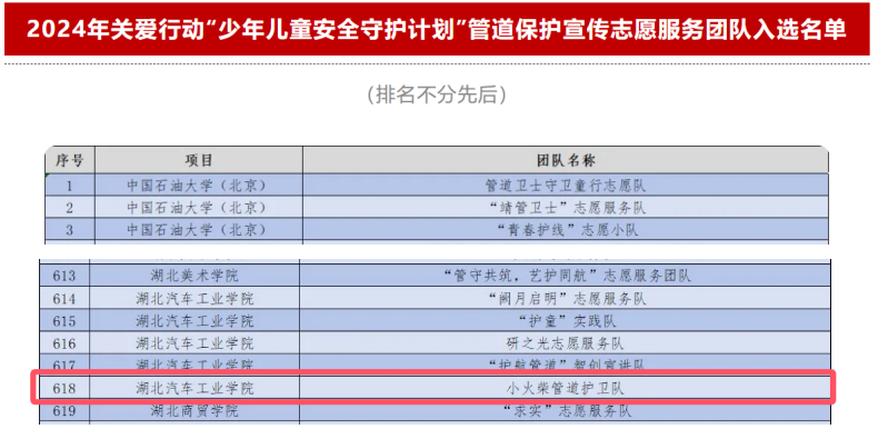 近日,由团中央青年志愿者行动指导中心、中国少年儿童新闻出版总社有限公司联合国家石油天然气管网集团有限公司共同开展的2024年关爱行动“少年儿童安全守护计划”管道保护宣传志愿服务团队入选名单公布。BB贝博艾弗森官网的小火柴管道护卫队成功入选,成为全国范围内来自各高校的1000支入选志愿服务团队之一。
