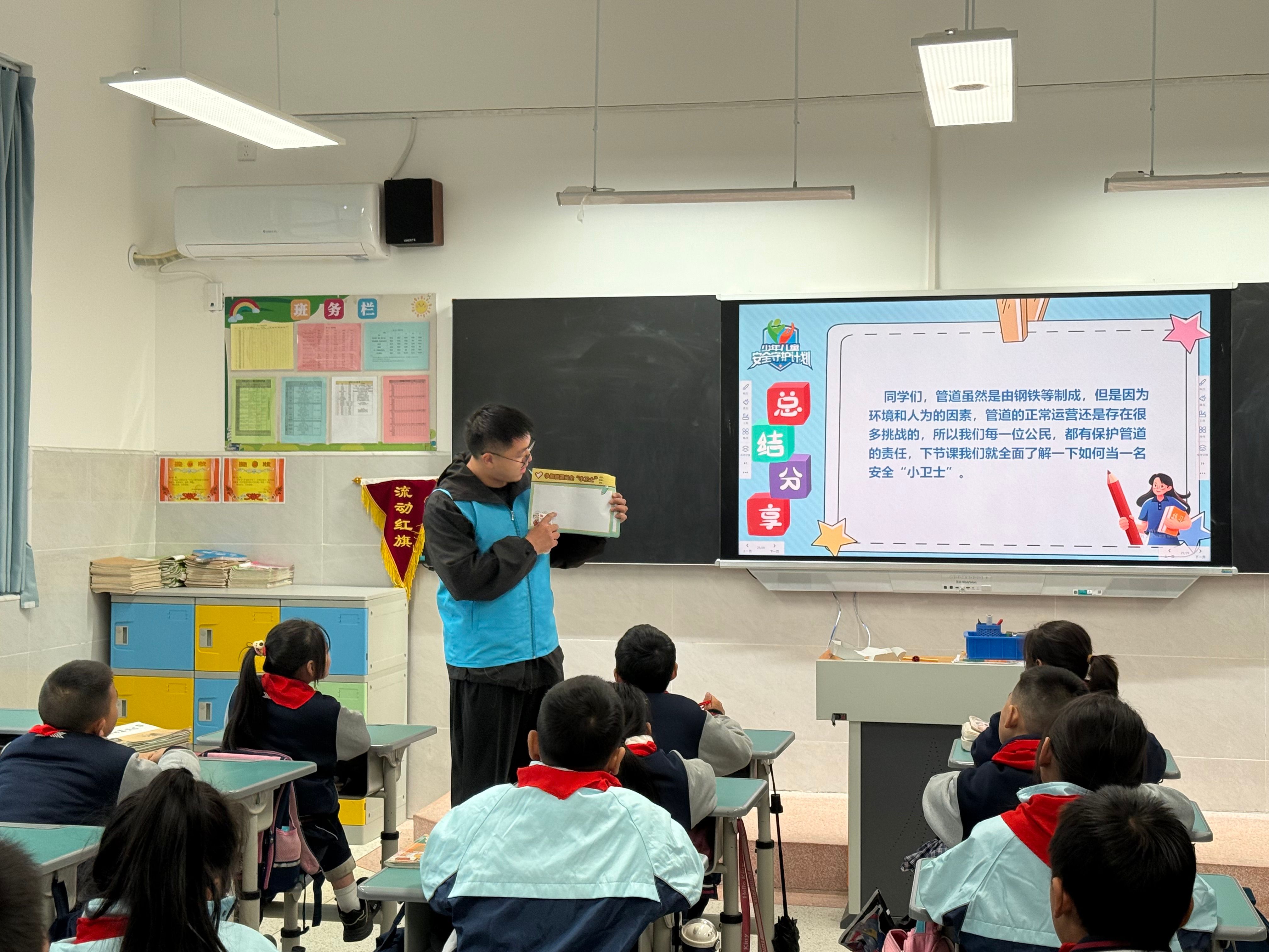 11月18日,护卫队同学再次来到黄龙小学,围绕“藏起来的地下公路”和“争做管道小卫士”两大主题开展系列宣讲活动。