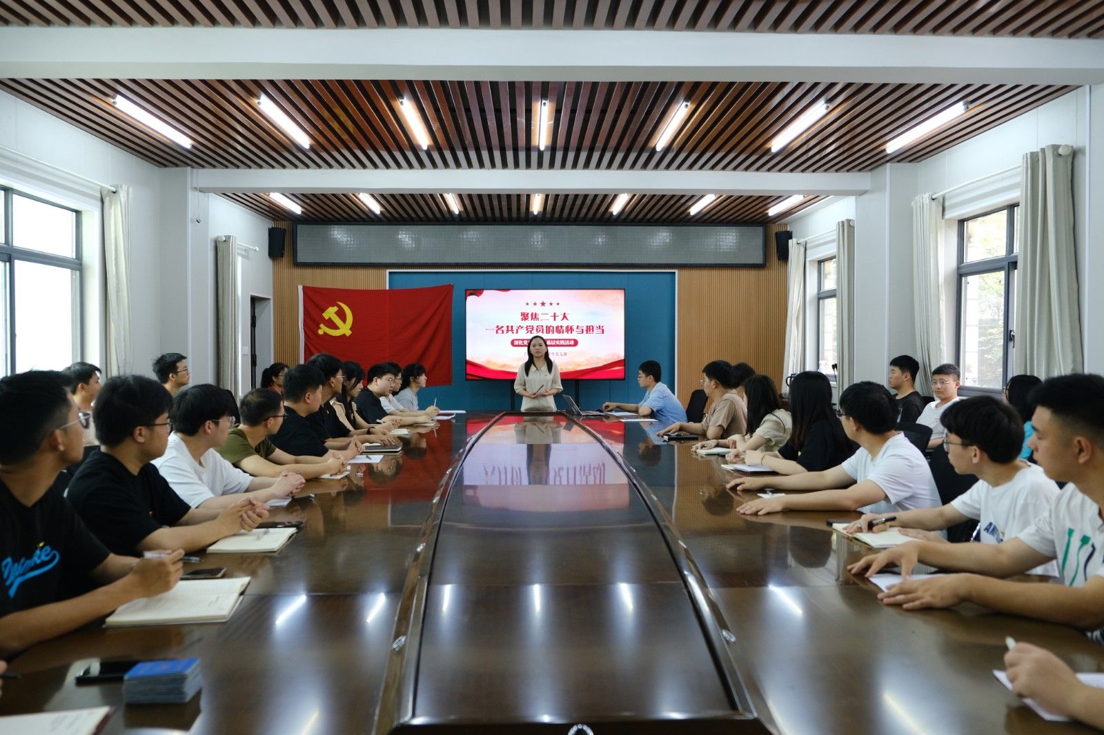胡霄寒以“聚焦二十大:一名共产党员的情怀与担当”为题进行党课讲授,她说到,无论是过去还是未来,我们要时刻清楚认识到青年党员必须厚植奋斗意识,涵养奋斗精神,时刻满怀激情,葆有“功成不必在我,功成必定有我”的担当情怀,努力把爱国之情、报国之志融入到未来的学业、工作中。她结合每一名毕业生党员的发展规划,言真意切地提出了建议。勉励大家要永葆初心,并提出了三点要求:一是要坚定理想信念、树立高远志向;二是锤炼党性品格,涵养政治本色;三是担当时代责任,打磨青春亮色。