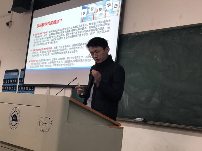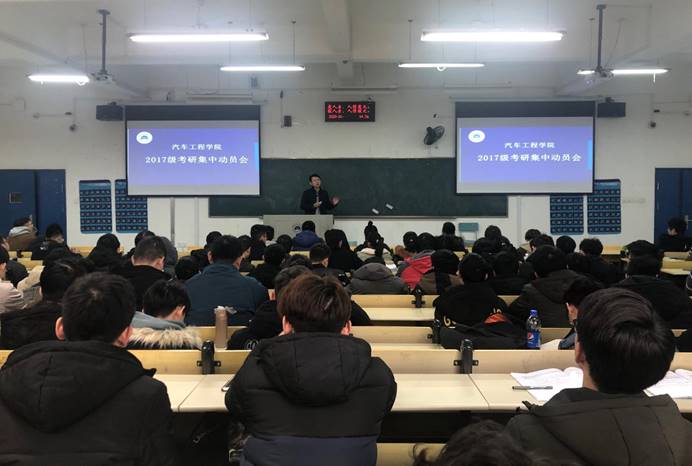 动员会上,李秀峰以PPT方式将17级的年级辅导员及班主任亲切可爱的照片展示出来,展现了学院老师与17级同学的浓厚师生情谊,引得现场一片热烈的掌声和笑声。随后他从学历学位常识、大学分类、学院毕业生考研情况、问题和建议四个方面进行了深入浅出的动员讲话。他强调了学历学位在终身职业发展中的重要作用,分析了当前国家高等教育发展形势和高校的分类,引导员工充分了解高校层次、进行合理定位,并以详细的统计数据和车院学子近五年考研录取情况加以分析,劝导大家理性思考、慎重选择。他还结合往届学子一个个鲜活的考研案例,分析了作为汽院员工在就业、考研、留学等方面的基础和优势,同时结合《汽车产业中长期人才发展研究报告》有关内容,鼓励同学们认清自我定位、树立充足自信,以更高标准对待自己的学业和将来的职业,积极选择考研深造。在考研问题和建议剖析部分,他要求同学们一定要思考和明确考研动机、学习能力、家庭条件、个人定力等问题,鼓励同学们利用即将到来的寒假,主动与父母进行沟通,尽早制定考研规划,“只争朝夕、不负韶华”,以奋斗之青春赴理想之未来。