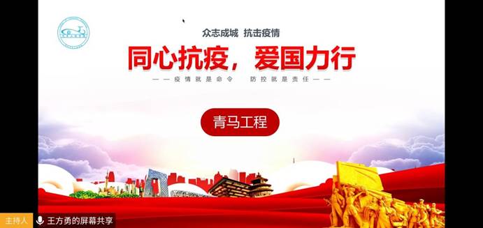 分团委副书记王方勇主持活动,介绍了学院2020年青马工程的总体计划和疫情期间开展此次活动的目的及其必要性。随后,员工党支部书记李雅琨作为此次活动的主讲人,以“同心抗疫、爱国力行”为主题进行了深刻的剖析和讲解。疫情就是命令,防控就是责任,她结合疫情期间国家快速组织专家、医疗物资、生活物资等各种资源同心抗疫的一个个实例,让同学们认识到中国特色社会主义制度集中力量办大事的优越性;通过疫情发展中,党中央的正确领导和基层一封封一线“请战书”清晰展示了中国共产党的伟大号召力;透过“最美逆行者”、志愿服务人员等奋战在一线抗疫防疫的人们和社会各界爱心人士的捐助、支援,讲述了人民力量的伟大,引申出爱国主义其实就在我们每个人的身边,我们青年人都要用自己的实际行动为国家为社会贡献一份力。她呼吁所有的车院学子们不断强化四个意识、坚定四个自信、践行两个维护,不信谣、不传谣、不恐慌,坚守光明、理性思考、传递正能量,争做新时代的青年榜样。