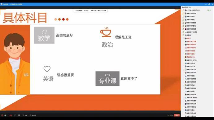 活动由员工会主席裴晓娟主持,她首先介绍了活动开展的目的、当前17级学子面临的抉择,学业职业发展压力等,强调了分享会的纪律要求并鼓励大家积极互动。随后,王贺结合自身考研前后经历,整体性提出建议大家考研必须下决心,一旦决定了就要勇往直前、绝不回头。复习过程中,平心静气、寻找盟友、客观评估是一个良好的开端,遇到复习困难要多与同学老师交流,疫情期间要充分利用现在的互联网平台开展线上复习,结合自己心仪考研学校的录考标准制定适合自己的一套循序渐进的复习计划。在具体各科目的复习经验方面,他说到英语是考研的拦路虎,提高英语水平重在平时的积累,每天抽出时间背单词、背作文都是必须坚持的,刷题也是备考最直观的提升方法。数学是工科考研的重头戏、是基础是关键,复习中除了不断的做真题,还要学会合理的利用错题集做到不在同一个问题上栽两次跟头,提高效率。政治重在理解要学会分析问题,知道出题人在问什么、自己要答什么,要做到答题有理有据。而专业课要学会把自己从书本上学习的基础知识进行提升,结合多重资料,扎扎实实巩固和提高。在互动交流环节,王贺耐心解答了每一名同学们的提问,还留下了联系方式和详细的复习笔记。他寄语备考的学子们:“考研路上不是一个人在战斗,我们都要对自己说的话负责任,说到了就得努力去做到,在遇到了困难时努力解决它,才能看出来你是不是真正的在用心前进”。