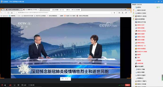 活动在学院分团委的组织下以主题团日的形式进行,分为集中观看新闻悼念直播、分班级开展主题讨论发言、撰写个人感受打卡校园圈分享三个环节。各年级在辅导员的带领下通过QQ群进行屏幕共享、语音通话、集中收看纪念活动,期间所有人在十点钟开始低头肃立为逝者默哀3分钟。浓浓的伤痛也是深深的动力,车辆195班一位北方的同学在自主发言中讲到:“多难兴邦,忧患砺党,危急识人。我不知道你是谁,我却知道你为了谁。让我们向奋战在抗击疫情一线的英雄们致以崇高敬意,向他们道一声:您辛苦了!让我们以英雄为榜样立足岗位、奋力担当,心手相连、同舟共济,坚决打赢疫情防控阻击战。”车服191班的一名武汉的同学分享到:“今天4月4号,我们怀着无比沉痛的心情去祭奠那些在新冠疫情中牺牲的烈士和同胞。作为一名土生土长的武汉人,对这次疫情有着更刻骨铭心的感触,从关闭公共交通开始,我们意识到病毒的恐怖,建国至今从来没有出现因病毒而封一座城。但每当灾难来临的时候,中国人总被我们当中最勇敢的一群人保护的好好的。国家迅速开始行动,各省医疗队立即来到疫情最严重的地方--武汉。支撑我继续在武汉坚守的是那些勇敢在防疫最前线的医疗人员,他们没有退缩,我们就永远放心。在这个差不多3个月的战役中,有那么多同胞在防疫工作中牺牲,我们需要铭记他们的付出。”下午6:30车院学子再次用最整齐、统一、诚挚的态度,在今日校园朋友圈分享了每个人的感悟,彼此拥抱、传递这份崇敬之情。