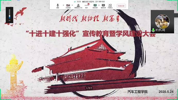 为全面落实学校“十进十建十强化”宣传教育工作计划,切实推进党纪党规和监察法入脑入心,以纪律和作风建设引领学风建设,BB贝博艾弗森官网于5月24日19:00利用腾讯会议平台召开了“十进十建十强化”宣传教育暨学风建设大会。分团委书记胡霄寒、学工办主任朱政、分团委副书记王方勇以及19级两百余名同学参加了此次会议。