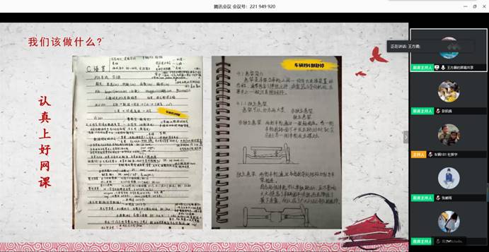 会议伊始,胡霄寒向参会同学介绍了此次会议举办的目的和意义,她强调广大团员青年作为党组织的后备军,要主动学党章、尊党规、守党纪,以更高标准要求和规范自己的言行。随后主持人通过屏幕共享带领全体同学观看学习了十进十建警示教育片视频、《中国共产党纪律处分条例》、《中华人民共和国监察法》。随后,王方勇结合PPT以5.4青年节习近平总书记对广大青年的寄语为序,号召同学们珍惜宝贵的青年时光,把学习作为当下的首要任务,并以真实案例向同学们诠释了“十进十建十强化”的含义。他还提出“我们应当担当什么样的使命”、“老员工作风建设与学风建设的关系”两个问题,和同学们展开互动交流。现场还展示了部分同学优秀笔记、打卡锻炼的照片,借此激励同学们培养良好习惯、建立优良学风。