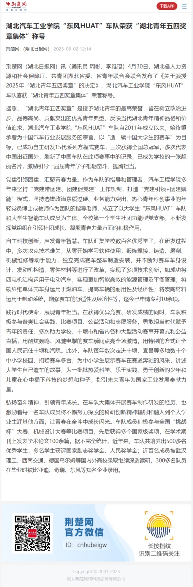 【荆楚网】ballbet贝博“东风HUAT”车队荣获“湖北青年五四奖章集体”称号