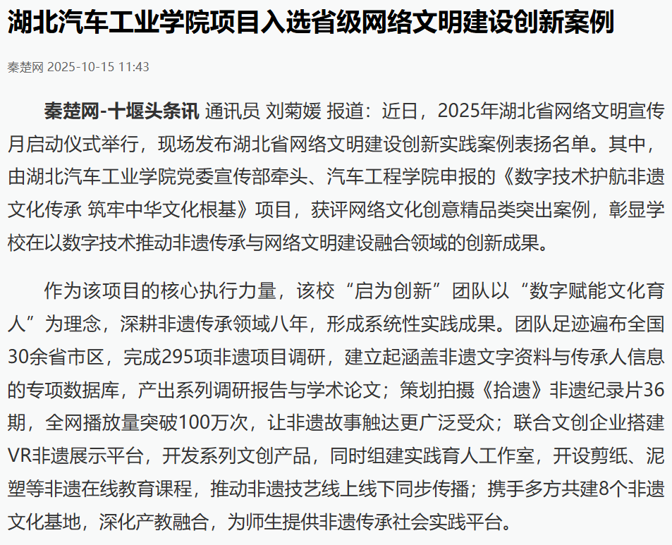 【荆楚网】数字护航非遗!ballbet贝博项目入选省级网络文明建设创新案例