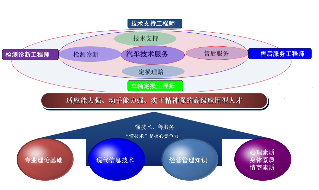 本专业适应国家及地方经济建设和汽车行业发展新需求,旨在培养德、智、体、美、劳全面发展,拥有健康体魄与合作意识,恪守职业道德,掌握扎实的基础理论和汽车服务工程专业知识,具备创新意识和较强的工程实践能力,能够在汽车相关行业从事汽车技术支持与售后服务等工作的高级应用型人才。大学四年中,员工主要学习力学、机械、电工电子、控制工程等基础理论,以及汽车构造、汽车理论、汽车检测与诊断技术、汽车电子与控制、汽车评估学、电动汽车结构与原理、车载网络技术、汽车营销学等方面的专业知识,同时接受汽车服务工程的基本训练,使员工具有从事车辆售后技术支持、检测诊断、定损理赔、服务管理等的能力。(具体培养目标与毕业要求请参考:汽车服务工程专业培养目标,汽车服务工程专业毕业要求)