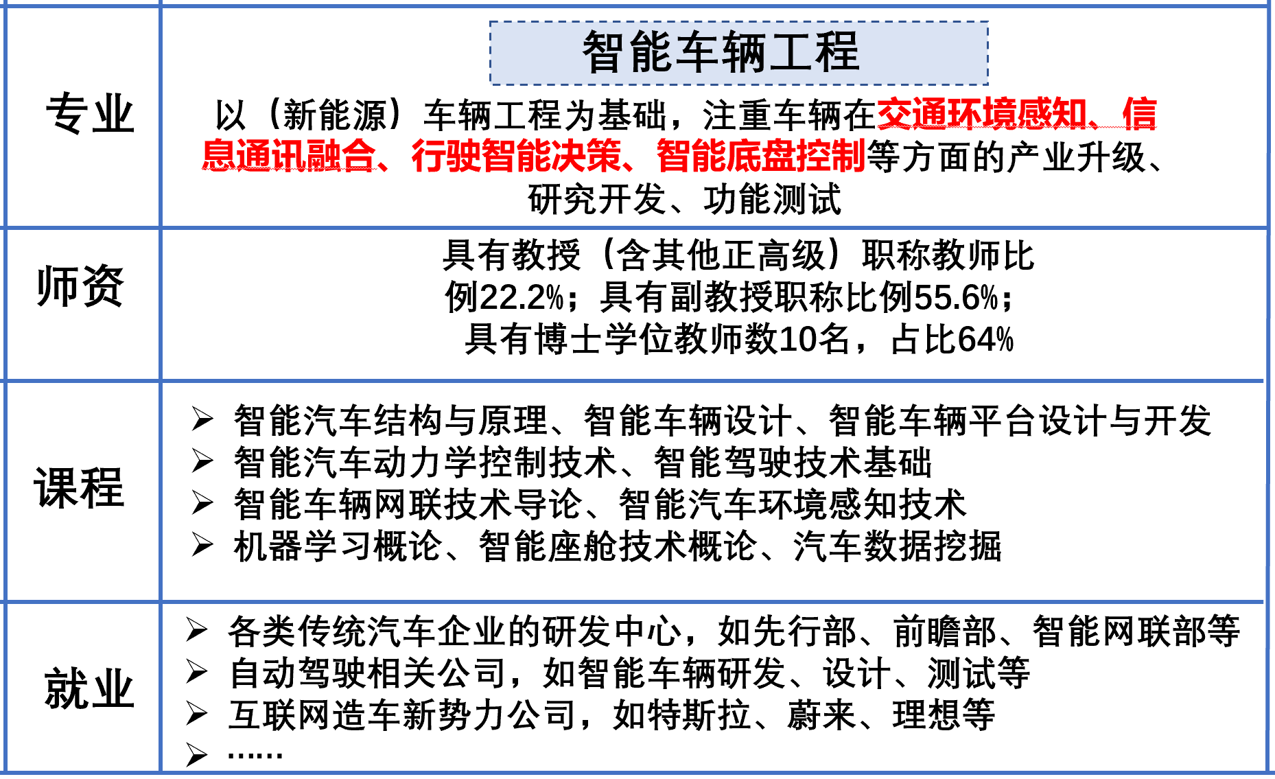 本专业紧跟国家及地方经济和行业发展需求,旨在培养德、智、体、美、劳全面发展,具有良好的职业素养、团队意识和责任担当精神的新时代人才。所培养的毕业生能够综合运用数理基础知识,以及新能源汽车结构原理、交通环境与感知、信息通讯与融合、路径规划与决策、人工智能与控制等专业知识,解决未来汽车产业的底盘升级、智能控制、信息通讯等多学科交叉的复杂工程问题,具备创新意识与较强的工程实践能力;可从事智能车辆工程领域相关的产品研发、架构设计、性能测试、技术支持及运维管理等工作。