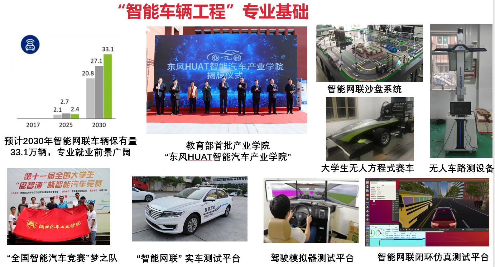 本专业依托东风汽车公司,以国家级汽车产业实验教学示范中心和国家级首批产业学院“东风HUAT智能汽车产业学院”为支撑,形成“产学互促,校企协同”的合作育人机制;以“智能模型车开发平台-智能网联沙盘教研平台-无人方程式赛车拓展平台”为代表的创新实践三平台为载体,实现了员工“基础-应用-综合”的创新实践能力培养;凸显智能车辆虚拟仿真、汽车电子与控制的专业特色,同时与注重与软件工程、电子工程等学科的交叉融合;优化课程体系,以科研促教学,实行模块化教学,培养工程实践能力强、具有创新意识的应用型专门人才。