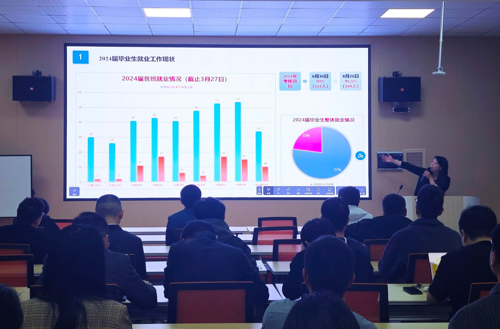 会上,就业辅导员李键雯汇报了学院近五年的毕业生就业去向落实情况及当前2024届毕业生就业现状,详细解读《ballbet贝博就业工作考核细则》,明确2024年就业工作目标考核任务。