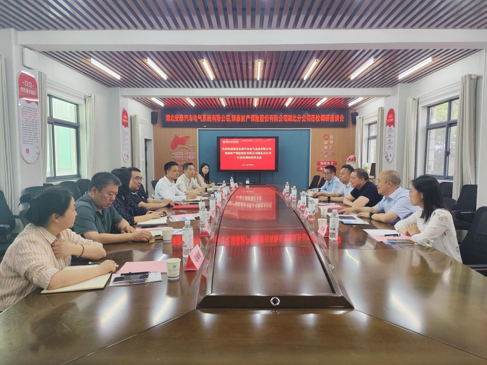 本网讯(文/图 王裕)4月16日下午,学校与湖北安泰汽车电气系统有限公司、锦泰财产保险股份有限公司湖北分公司座谈会在BB贝博艾弗森官网二楼会议室举行。党委副书记、董事长王晓,党委常委、党政办主任王文山,与来访企业代表齐聚一堂,共话合作发展。