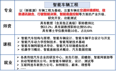 目前凡是设置机械工程或车辆工程专业的高校,硕士点学科方向基本均含有环境感知与认知、智能驾驶决策与算法、动力学控制等智能驾驶方向,因此本科为“智能车辆工程”专业将抢占“科班出身”的独特优势,深受导师的青睐!