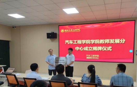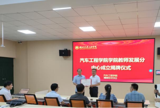 董焱章副经理宣读了《关于成立汽车工程学院教师发展分中心的通知》(车院院发〔2024〕6号),随后由胡明茂经理与郭一鸣教授共同为公司教师发展分中心进行揭牌仪式,杨亚会书记向公司教师发展分中心特聘顾问郭一鸣教授颁发聘书。
