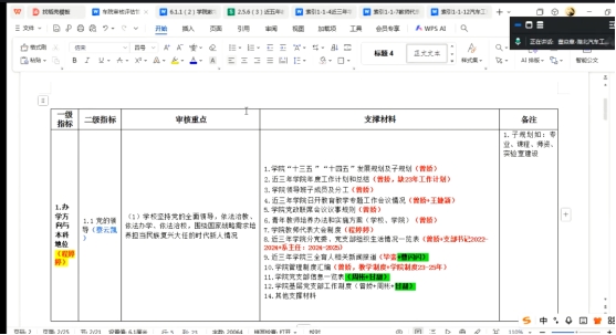 会议首先明确了审核评估管理档案清单的构成,包括七个一级指标、下设的二级指标、审核重点及其支撑材料等四层文件关系。每个支撑材料文件均有指定的提供人,上面的审核重点根据需要设定负责人,二级和一级指标均有负责人。。