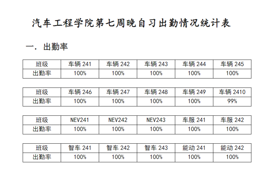 【督学正风】BB贝博艾弗森官网2024-2025学年第一学期第七周晚自习出勤情况