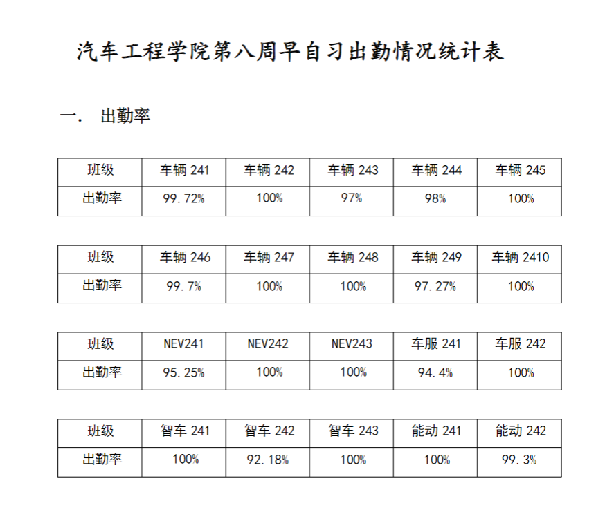 【督学正风】BB贝博艾弗森官网2024-2025学年第一学期第八周早自习出勤情况