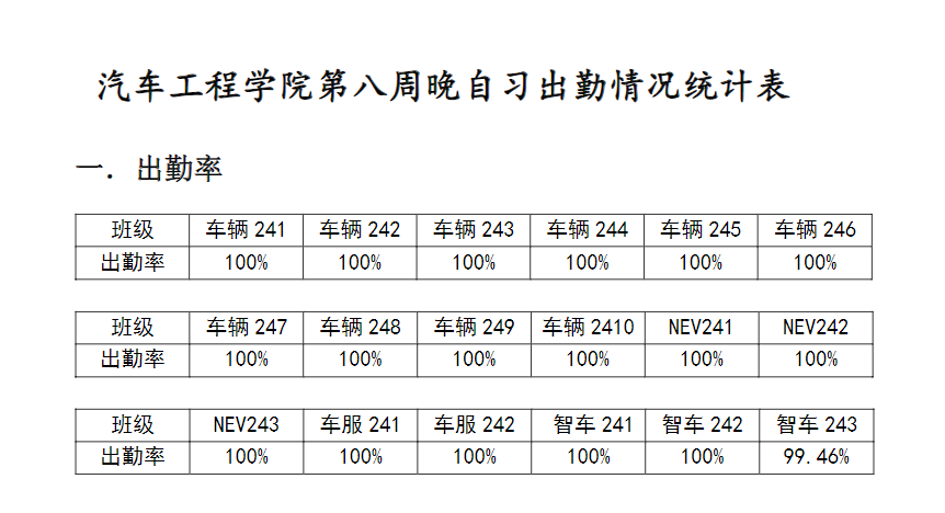 【督学正风】BB贝博艾弗森官网2024-2025学年第一学期第八周晚自习出勤情况