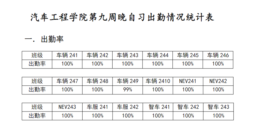 【督学正风】BB贝博艾弗森官网2024-2025学年第一学期第九周晚自习出勤情况
