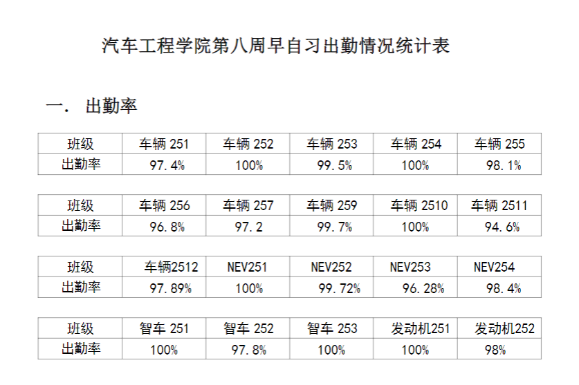 【督学正风】BB贝博艾弗森官网2025-2026学年第一学期第八周早自习出勤情况